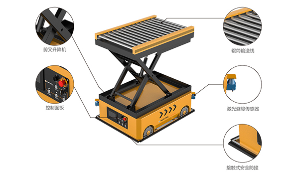 麥克納姆輪全方位任意全向移動,非接觸式激光避障傳感器及車身有接觸式防撞機構除需日常充電外,無其他維護成本;設備運行時有聲光警示;并設有系統故障診斷及電量顯示功能;控制面板顯示屏實時狀態顯示,并顯示故障信息; 輥筒輸送實現不同高度物料對接,實現輸送柔性化; 帶起升功能剪叉升降機,實現輥筒的升降;根據工況需求搭載不同的導航方式;