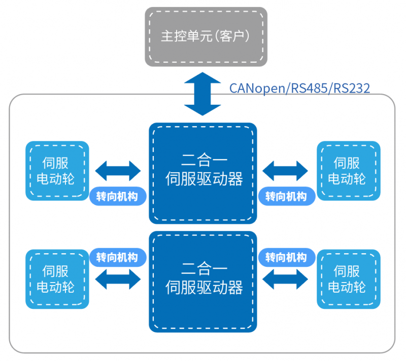 由于低壓伺服電動輪具備單個車輪獨立驅動的特性,因此無論是前驅、后驅還是四驅形式,它都可以比較輕松地實現。同時,低壓伺服電動輪可以通過左右車輪的不同轉速甚至反轉實現類似履帶式車輛的差動轉向,大大減小機器人的轉變半徑,甚至可以實現原地轉向。