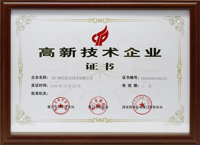 發(fā)證機(jī)構(gòu):   廈門市科學(xué)技術(shù)局/廈門市財政局/國家稅務(wù)總局廈門市稅務(wù)局 發(fā)證時間 :   2020-10-21