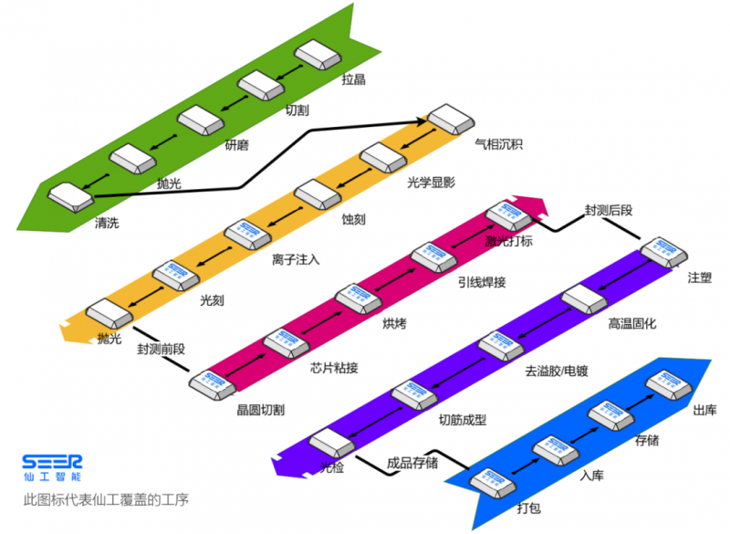 仙工智能經(jīng)過多年的耕耘,已經(jīng)覆蓋了半導體行業(yè)制程工序的絕大部分工序,從 IC 制造到 IC 封測的工序間物料到成品和原材料的存儲和出入庫等傳統(tǒng)物流工序都有覆蓋。今天分享的就是其中的晶圓處理制程。