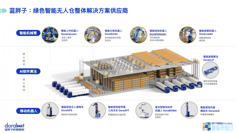 上件機(jī)器人DoraInductor、分揀機(jī)器人DoraSorter、包裝機(jī)器人DoraPacker、復(fù)合型移動(dòng)協(xié)作機(jī)器人DoraMOMA等智能機(jī)器人齊上陣,讓人眼前一亮。值得一提的是,藍(lán)胖子裝載機(jī)器人DoraLoader也在媒體開放日上首度曝光,將在不久的未來落地實(shí)際應(yīng)用。