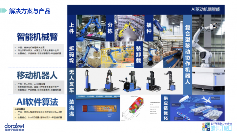 藍(lán)胖子產(chǎn)品主要包括軟硬件相結(jié)合的上件機(jī)器人、分揀機(jī)器人、無人叉車、拆碼垛機(jī)器人、裝卸載機(jī)器人等,并積累了多種規(guī)劃及優(yōu)化算法,包括智能裝箱算法、智能調(diào)度算法以及多機(jī)規(guī)劃算法。