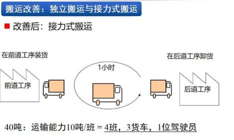 · 搬運(yùn)改善后采取的混載搬運(yùn)、接力式搬運(yùn)、中轉(zhuǎn)站搬運(yùn)均起到了大幅提高效率,降低人工成本的作用