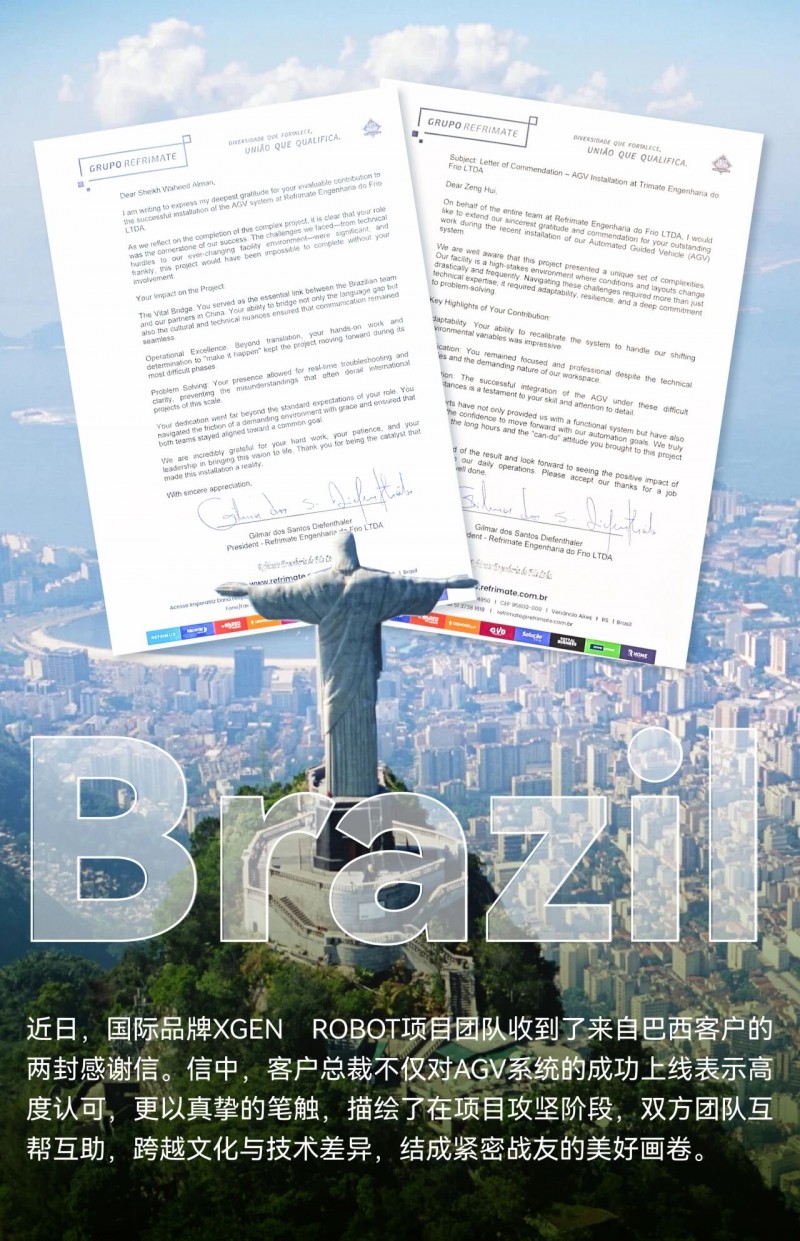 核心提示:近日,國際品牌XGEN ROBOT項目團隊收到了來自巴西客戶的兩封感謝信。信中,客戶總裁不僅對AGV系統的成功上線表示高度認可,更以真摯的筆觸,描繪了在項目攻堅階段,雙方團隊互幫互助,跨越文化與技術差異,結成緊密戰友的美好畫卷。