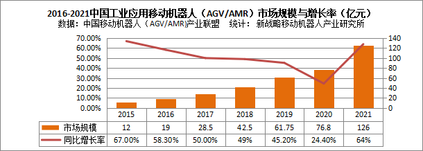 圖:2015-2021中國工業(yè)應(yīng)用移動機(jī)器人(AGV/AMR)市場規(guī)模(億元)與增長率
