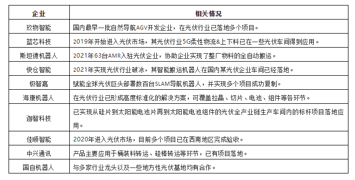 圖表:2021年光伏行業新增AGV/AMR類型分布整體來看,當前光伏行業的AGV/AMR應用還處于前期的階段,整體需求還未完全釋放,競爭相對較低,但伴隨著光伏行業近兩年投資擴產風潮的盛行,以及光伏企業對AGV/AMR產品認知度的不斷提高,光伏行業對AGV/AMR需求也在逐步放量。當前,光伏行業已經成為AGV/AMR企業重點布局領域之一。由于光伏行業對AGV/AMR的需求以自然導航類為主,當前,聚焦光伏行業的AGV/AMR企業也大部分以專注于自然導航(SLAM)類產品的企業為主,如藍芯科技、斯坦德、快倉智能、極智嘉、海康機器人、迦智科技、佳順智能、中興通訊、玖物互通等。這些企業依托自然導航核心技術,結合光伏行業需求特點,也相繼形成了光伏行業解決方案。