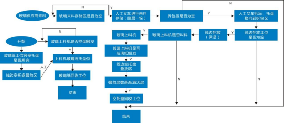 關節機器人主要運用在了電池片焊接、排版、裝邊框、注膠等環節,而移動機器人主要用于不同工序之間的工序對接。在光伏行業生產線上,從上游到下游需要用到多種不同類型的AGV。一般會用到叉車AGV對冶金級別的硅礦(若原料為太陽能級多晶硅材料,則采用潛伏頂升式AGV)等原材料進行運輸,將原料送上產線進行裝料,在高純度石英干過中按層次裝入塊料、粉料、顆粒料、摻雜劑然后放入石墨坩堝合爐,再進行抽空檢漏→壓力化→化料→引晶→縮頸→放肩→轉肩→等徑生長→收尾、停爐的步驟。電池生產工藝環節空間適中,標準化程度高,規模較大。在傳統生產模式中有大量的工藝對接及半成品上下料搬運對接由人工完成,在人員、流程管理、同步時效性上對用戶有一定困難及挑戰:①生產現場要求24小時連續作業,作業人員3班輪替,勞動強度大,導致人員流動性較大,企業管理成本劇增;②人工在生產設備前上料時,雙手只能同時操作單個電池片載具依次上料,效率低下;③生產工藝復雜,對物料上料時的擺放、朝向、整齊度都有嚴格要求,要求作業人員低容錯率和規范化作業,如在太陽能電池片生產過程中,有一道工序是將硅片插入花籃中,并將插滿硅片的花籃運輸至其它工藝設備處,以進行后續生產作業。為了將硅片準確地插入花籃中,一般通過工作人員人工操作,一片一片地將硅片插入花籃中。此外,將插滿硅片的花籃運輸至其它工藝設備處也是通過工作人員人工搬運實現的。由于硅片本身具有薄、脆等特點,因此,相關技術在將硅片插入花籃中時,容易因為工作人員力道不均而損壞硅片。④不同工藝環節之間由人工完成物料的搬運與上料,中間環節物料信息缺失,異常原因難以追溯。為了解決傳統人工模式存在的種種問題,光伏廠商開始在電池片生產車間引進AGV/AMR,實現從發料至下線,及生產中制絨、擴散、激光、刻蝕、退火氧化、鍍膜、背膜、正膜、絲網印刷等工藝的對接搬運,實現硅料、硅片安全高效的自動化轉運。當前,在電池片生產流程中,主要應用的AGV/AMR車型有兩種,分體式與一體式AGV,分體式AGV是直接頂升貨架,再與自動化設備或者主機臺工藝設備進行對接,一體式AGV則是上方會有傳輸帶(如輥道等)配件,可直接作為生產線傳輸帶的一部分。玻璃原片上料—EVA裁切鋪設—自動上模板—自動串焊—自動擺串—上背玻—EL測試單元—緩存堆棧—混進定位單元—層壓機—混出定位單元—自動修邊—翻轉檢查單元—自動裝框—上料機—固化—清洗--下料機—絕緣耐壓測試—IV測試單元—自動分檔—自動包裝—自動出入庫等。組件生產AGV自動小車自動按需運輸流程大致流程如下:
