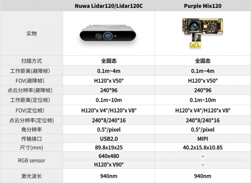 產(chǎn)品將重點針對機器人應用領域,有效解決導航、避障功能模塊分離造成的機器人整機產(chǎn)品形態(tài)設計困難、傳感模塊多而成本高的問題。此外,傳統(tǒng)的LDS、單點/多點dToF線掃導航模塊都需要采用機械式或半固態(tài)的設計,可靠性易受影響,而Nuwa-Lidar120和PurpleMix120都采用了全固態(tài)的方案,產(chǎn)品內(nèi)部沒有任何的機械振動和微機械振動,是針對產(chǎn)品可靠性和壽命優(yōu)化最理想的方案之一。