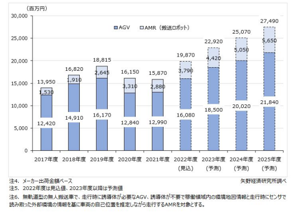 預(yù)計(jì)22財(cái)年日本AGV/AMR的市場規(guī)模(制造商出貨量)為7700臺(同比增長20.3%),銷售額為198.7億日元(同比增長25.2%)。雖然半導(dǎo)體短缺的影響仍在繼續(xù),但制造商在前一年努力改善和加強(qiáng)供應(yīng)系統(tǒng)是積極因素,預(yù)計(jì)三年來首次出現(xiàn)增長。