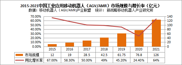 2015-2021中國工業(yè)應(yīng)用移動(dòng)機(jī)器人(AGV/AMR)市場規(guī)模(億元)與增長率