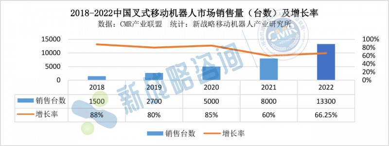 據(jù)CMR產(chǎn)業(yè)聯(lián)盟數(shù)據(jù)、新戰(zhàn)略移動(dòng)機(jī)器人產(chǎn)業(yè)研究所統(tǒng)計(jì),2022年中國(guó)叉式移動(dòng)機(jī)器人銷量達(dá)13300臺(tái),同比增長(zhǎng)66.25%,市場(chǎng)規(guī)模約為34.68億元,同比增長(zhǎng)41.55%。