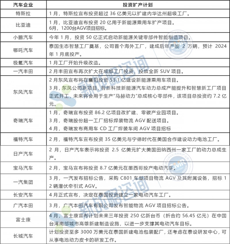 上半年部分車企投資擴產及AGV項目招標情況分析(根據公開信息整理,如有錯誤,請指正!)