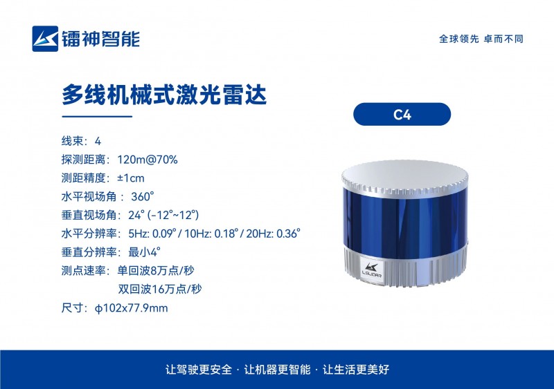 鐳神智能多線(xiàn)機(jī)械式激光雷達(dá)C4、C8和CH16R采用TOF時(shí)間飛行法,實(shí)現(xiàn)對(duì)周?chē)h(huán)境360°三維高速掃描,探測(cè)距離高達(dá)120m,測(cè)距精度可達(dá)±1cm,不易受外界環(huán)境光影響,產(chǎn)品體積小,具備非常強(qiáng)的應(yīng)用價(jià)值,可廣泛應(yīng)用于無(wú)人叉車(chē)、服務(wù)機(jī)器人、AGV、無(wú)人駕駛、安防、港口等領(lǐng)域,支持建圖、定位、識(shí)別、避障等功能,幫助客戶(hù)打開(kāi)更多市場(chǎng)空間。