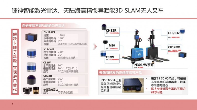 在論壇分享會上介紹了無人叉車配置的技術(shù)領(lǐng)先全球的鐳神智能激光雷達系列產(chǎn)品,解決了卡脖子難題,實現(xiàn)國產(chǎn)化自主可控,每臺無人叉車周身配置7-8顆激光雷達,提供豐富穩(wěn)定的全方位立體感知信息,做到更安全、更穩(wěn)定、更可靠。