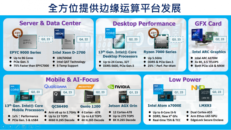 張家豪認為目前邊緣運算有兩大發(fā)展方向:第一是往高效能發(fā)展,強調High performance computing(HPEC);第二是往Edge AI發(fā)展,研華在Embedded Design-in的核心競爭力除了積累多年的實戰(zhàn)經驗之外,還可為客戶提供一系列的R&D服務、技術設計服務,包括軟件和硬件。相比傳統(tǒng)的嵌入式計算,研華看到了從低功耗、標準通用型平臺到邊緣運算的轉變。因此,研華非常重視產品的高效能發(fā)展,特別是在HPEC架構下。此外,研華也看到了AI技術對于邊緣運算產業(yè)和嵌入式電腦產業(yè)的趨勢,因此他們正在努力將AI技術導入,形成Edge AI平臺。