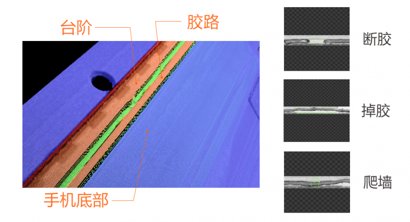 檢測手機中框點膠質量,包括膠寬、膠高、斷膠及塌膠、爬墻和掉膠