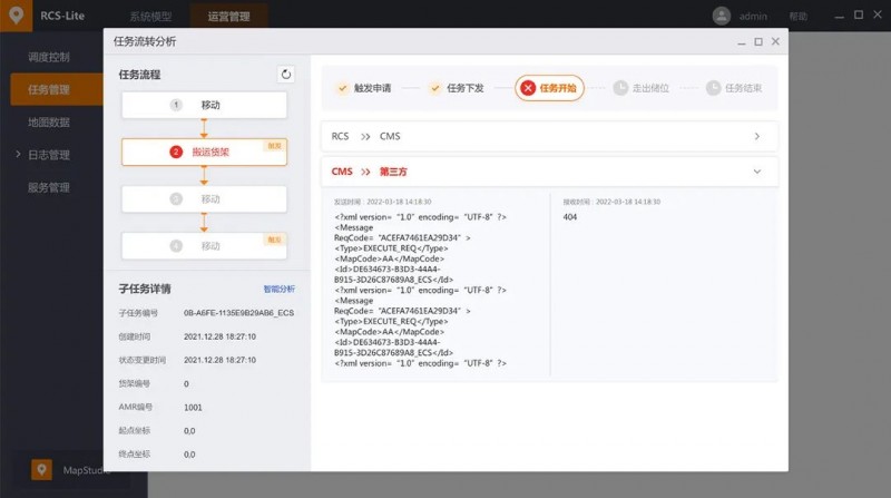 在AMR核心任務處理單元中,可呈現全鏈路任務流轉圖,將任務從下發到完成的所有交互信息直觀展示,讓現場實施交付更高效,可用于工廠物流場景中的儲位管理、任務管理、貨架/容器管理等場景。