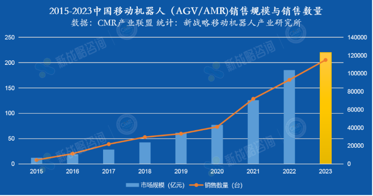 圖表:2015-2023中國AGV/AMR銷售數(shù)量與市場增長率