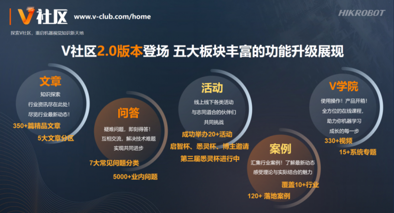 V社區(qū)升級至2.0版本,已形成文章、問答、活動(dòng)、案例、V學(xué)院五大板塊,匯集350多篇精品文章、330多條講解及應(yīng)用視頻、5000多個(gè)專業(yè)問題、120多個(gè)實(shí)踐案例、20多場活動(dòng),助力機(jī)器視覺愛好者快速學(xué)習(xí)成長。