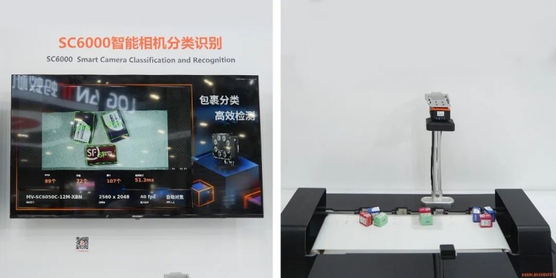 該相機采用高性能AI嵌入式平臺開發,內置VM算法開發平臺,多種通訊協議,場景適應能力強?,F場展示的是SC6000對流通行業快遞包裹進行分類識別,可準確對傳送帶上不同類別包裹進行準確定位和類別分類。
