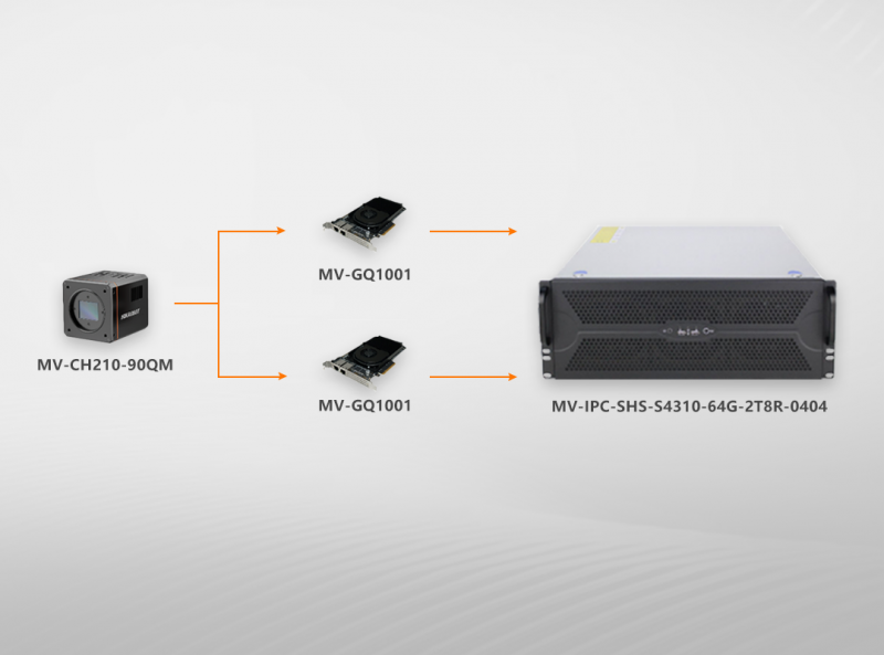 方案采用CH系列2100W分辨率/540幀面陣相機(jī),通過(guò)2張50G單口光口卡GQ1001,將所有原圖數(shù)據(jù)同步傳輸至14GB/s連續(xù)寫(xiě)入性能,16TB容量的SHS系列高速讀寫(xiě)服務(wù)器中。