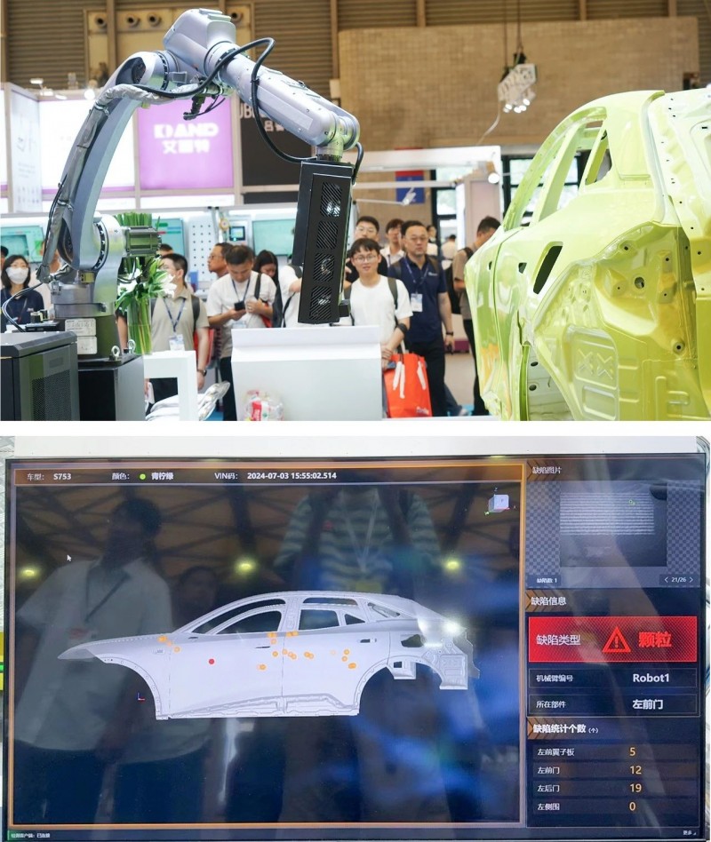 采用??禉C(jī)器人自研的程控條紋光傳感器進(jìn)行采圖,對車漆表面的顆粒,漆疤、劃痕、氣泡、針眼等缺陷進(jìn)行在線全檢,最小可實(shí)現(xiàn)0.2mm的缺陷檢測,借助機(jī)械臂的柔性,檢測可達(dá)性區(qū)域幾乎覆蓋100%車身。