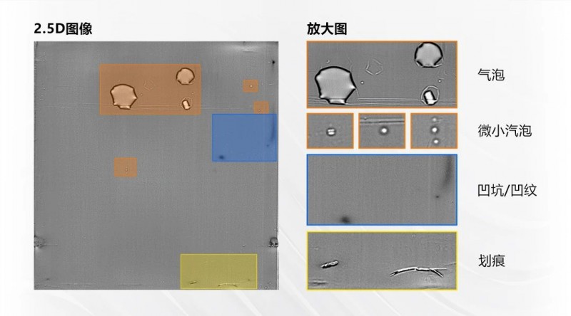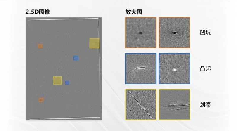 檢測效果:去除覆膜表面顏色和反光影響,有效檢出微小缺陷,對有無高度變化的缺陷進行區分