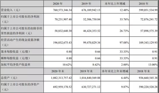 據寧波中大力德智能傳動股份有限公司發布的2020年年度報告顯示,公司2020年度實現營業收入 7.61億元,同比增長12.48%;歸屬于上市公司股東的凈利潤7023.19萬元,同比增長33.76%,扣除非歸母凈利潤為5883萬,同比增長26.73%。