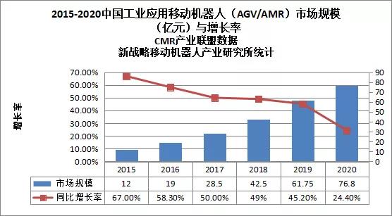 圖表:2015-2020中國(guó)工業(yè)應(yīng)用移動(dòng)機(jī)器人(AGV/AMR)市場(chǎng)規(guī)模(億元)與增長(zhǎng)率