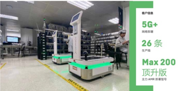 全球領先的某大型通信設備公司無線小基站智能工廠項目,迦智科技近百臺自然導航AMR,在5G技術低延時、高帶寬、高速率的傳輸特性加持下,實現(xiàn)了與用戶現(xiàn)場的MES、WMS以及第三方設備間的互聯(lián)互通,信息上傳下達,交互協(xié)同作業(yè)。