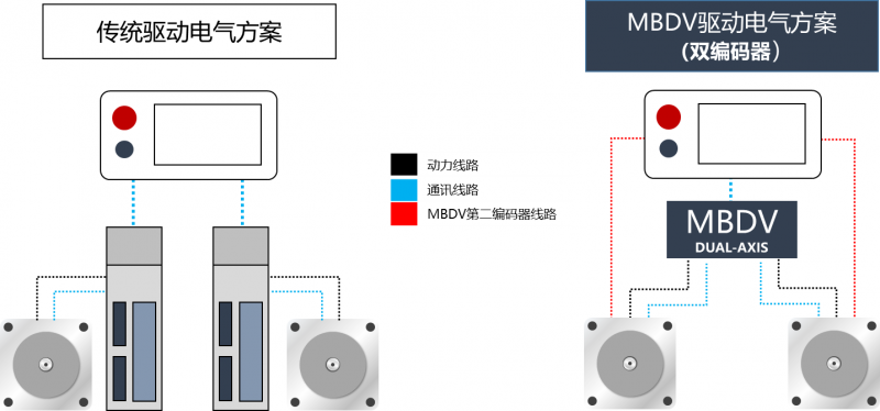 2020年11月CeMAT(亞洲國際物流技術與運輸系統(tǒng)展覽會)展上鳴志隆重發(fā)布了MBDV型二合一低壓伺服驅動產品。MBDV采用緊湊型設計,體積縮小36.8%,支持20-60V寬電壓輸入,兼容全信號A/B/Z & Hall型和通訊型兩種編碼器伺服電機,可以適配100W~750W低壓伺服電機。MBDV是根據未來5年AGV/AMR發(fā)展需求而設計,相對于現有方案具有技術領先優(yōu)勢:
