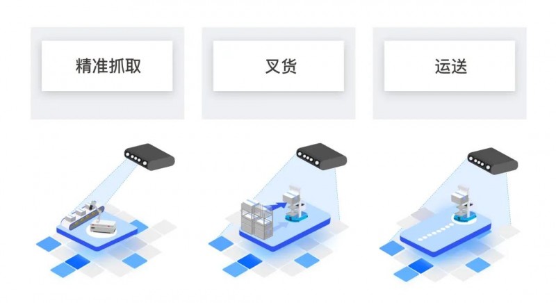 在產線上,RoboView Server 能夠連接多種不同類型的相機,如使用激光相機拍攝視野中任意位置的貨物,對獲取到的 3D 點云,運用點云算法識別、定位算法精確(最高可精度達到0.1mm)的計算出產品的位姿和外形尺寸信息,并發(fā)送給機械臂或 AGV,精準抓取、 裝包或叉貨、運送的任務,或是智能引導涂膠等