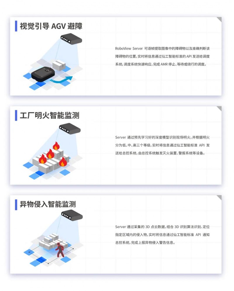 RoboView Server 通過攝像頭實時采集的現(xiàn)場視頻,經過不同的視覺算法判斷現(xiàn)場情況,實時 通過仙工智能標準 API 發(fā)送給對應的調度系統(tǒng)或總控系統(tǒng),以確保工作、生產安全進行。