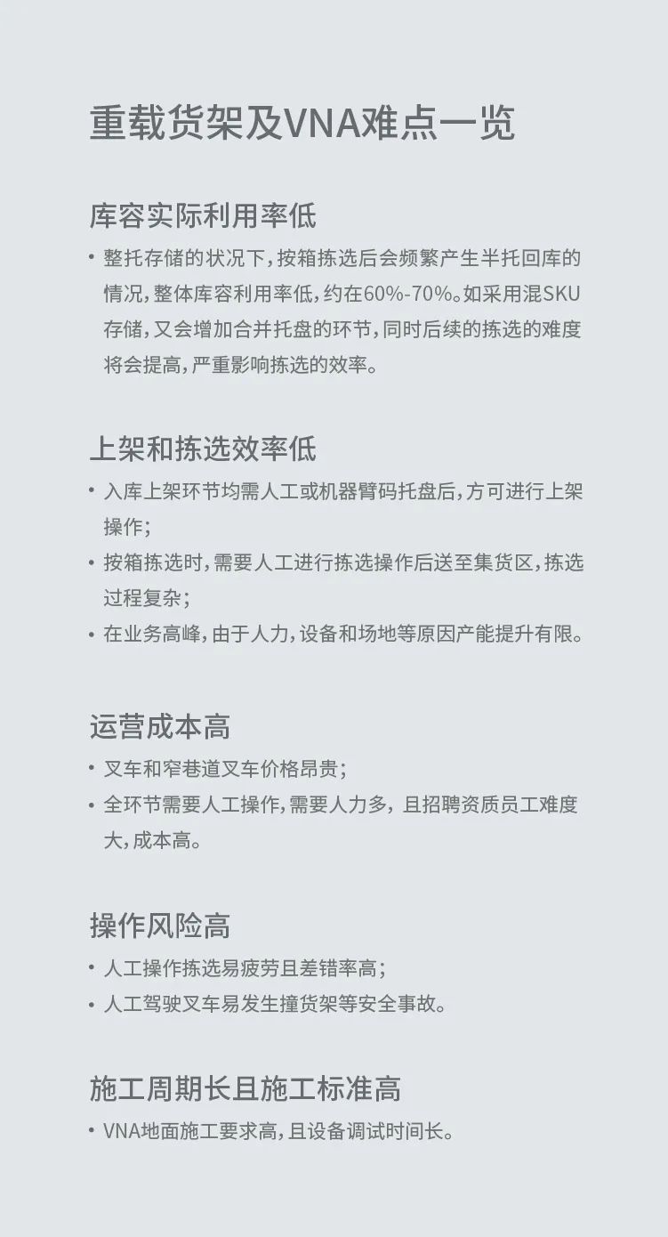 RS8-DA貨箱機(jī)器人主打服裝行業(yè)整箱存取場(chǎng)景,目前,該場(chǎng)景大多采用重載貨架配合人工叉車(chē)進(jìn)行揀選,而這種形式多面臨以下難點(diǎn):