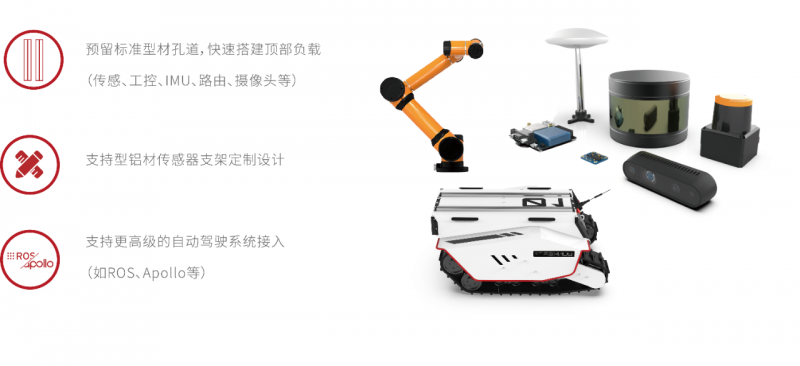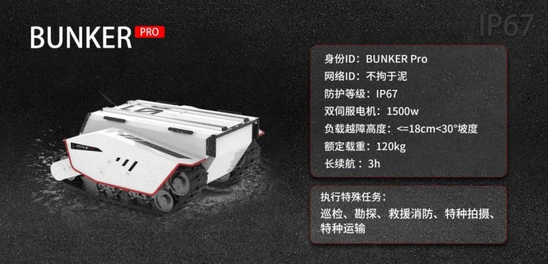 可以說,BUNKER Pro提供了在野外、箱涵、石泥路等高挑戰(zhàn)性環(huán)境下最佳的移動(dòng)開發(fā)平臺(tái),助力機(jī)器人行業(yè)和科研客戶快速部署和開發(fā)特殊作業(yè)機(jī)器人,諸如巡檢、勘探、消防、特種拍攝、特種運(yùn)輸?shù)葢?yīng)用。BUNKER Pro外觀結(jié)構(gòu)全新設(shè)計(jì),車身重心位置低,裝置了1500W雙伺服電機(jī)進(jìn)行驅(qū)動(dòng),極具越野性。此外,其采用了克里斯蒂懸掛和瑪?shù)贍栠_(dá)四輪平衡多懸掛系統(tǒng)組合,并于全車安裝了加強(qiáng)版避震器和防撞擊結(jié)構(gòu)組件,外觀采用了高強(qiáng)度和大厚度的鋼材,這為執(zhí)行特種作業(yè)應(yīng)用提供了可靠的減震系統(tǒng)性能。 目前,BUNKER Pro最高越障可達(dá)18cm,爬坡度為<=30°,這意味著面對(duì)野外坡道和廠區(qū)樓梯,BUNKER Pro都可以一舉輕松爬越和穩(wěn)定運(yùn)行。BUNKER Pro驅(qū)動(dòng)形式為履帶差速轉(zhuǎn)向和左右獨(dú)立驅(qū)動(dòng),自研運(yùn)動(dòng)控制系統(tǒng)電機(jī)采用了2500線光電增量式碼盤,可以在復(fù)雜道路中實(shí)現(xiàn)高精度的控制,并且可以柔性實(shí)現(xiàn)0轉(zhuǎn)彎半徑原地自旋。BUNKER Pro外觀配置了防撞耐用的鋼質(zhì)結(jié)構(gòu), 且整車結(jié)構(gòu)、材料以及外置電氣元件均采用均采用高防護(hù)等級(jí)設(shè)計(jì),達(dá)到了IP67安全標(biāo)準(zhǔn),這是市面上同級(jí)別綜合路況移動(dòng)平臺(tái)中防護(hù)等級(jí)最高的。其具備沙塵滲透防護(hù)、移動(dòng)涉水和短暫浸泡防護(hù)(防浸)等優(yōu)勢,無懼任何潮濕、涉水、越野等極限工作環(huán)境,可以保證BUNER Pro極大拓展機(jī)器人的使用場景。基于高等級(jí)防護(hù)、模塊化和精簡部件結(jié)構(gòu)設(shè)計(jì),BUNKER Pro車體后期清潔也是十分便捷的,不藏污垢,不易腐蝕,易于維護(hù)。標(biāo)準(zhǔn)二次開發(fā)拓展應(yīng)用BUNKER Pro平臺(tái)空間大,可以在原地自旋過程中達(dá)到120kg載重,這意味著可以輕松搭載各類檢測設(shè)備。用戶可通過CAN總線協(xié)議與主控通訊,快速接入傳感系統(tǒng),搭建自主應(yīng)用開發(fā)平臺(tái),同時(shí),BUNKER Pro也支持定制高級(jí)操作模式(遠(yuǎn)程駕駛/自動(dòng)駕駛),提供開源SDK、ROS_PACKAGE。BUNKER Pro還具有大電池容量,可在常規(guī)路面載重120kg運(yùn)行情況下支持3小時(shí)續(xù)航, 也可對(duì)搭載的傳感器等外部設(shè)備進(jìn)行供電, 為機(jī)器人應(yīng)用的作業(yè)提供充足和便捷的運(yùn)行保障。