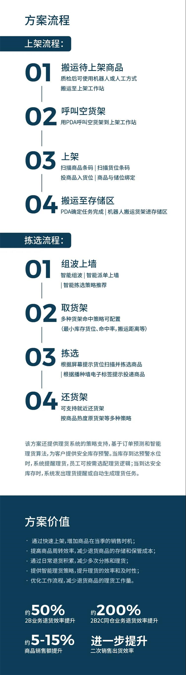 核心提示:方案價值:2B業務退貨效率提升約50%,2B2C同業務退貨效率提升約200%,商品銷售額提升約5 -15%,二次銷售出貨效率進一步提升。